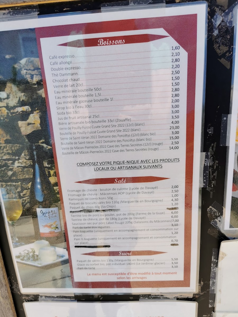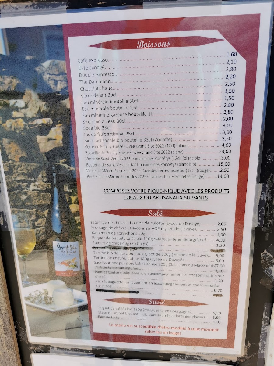 As for beverages, Café de la Roche's selection of artisanal drinks is not to be missed. Sample their exquisite homemade sodas, including refreshing limonade, Coca-Cola, and ice tea, all priced at just €2.00. Don't overlook the delicious artisanal fruit juices, available in flavors like apple, orange, grape, and tomato, for only €2.40. For the beer enthusiasts, try the local Zouaffe, a craft beer brewed in nearby Cluny, which caters to various tastes—be it blonde, white, or amber.
